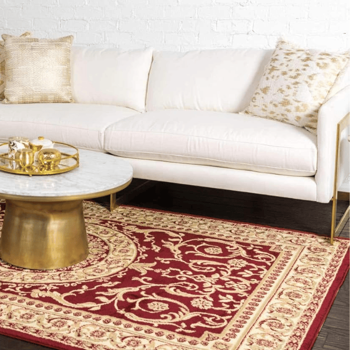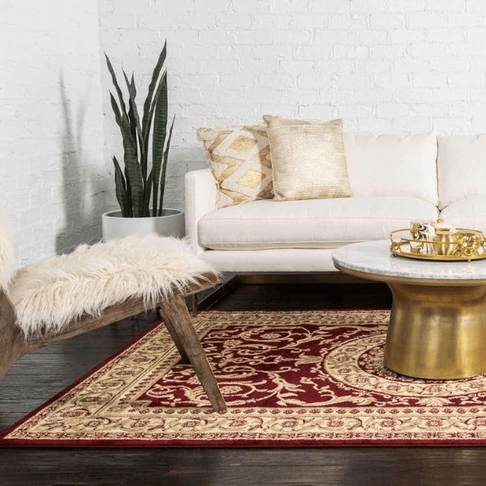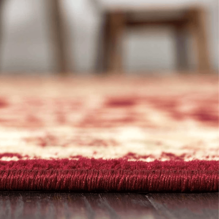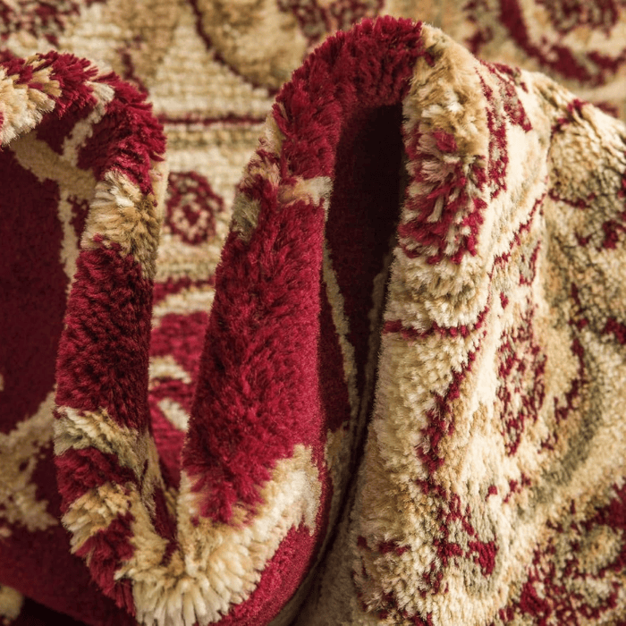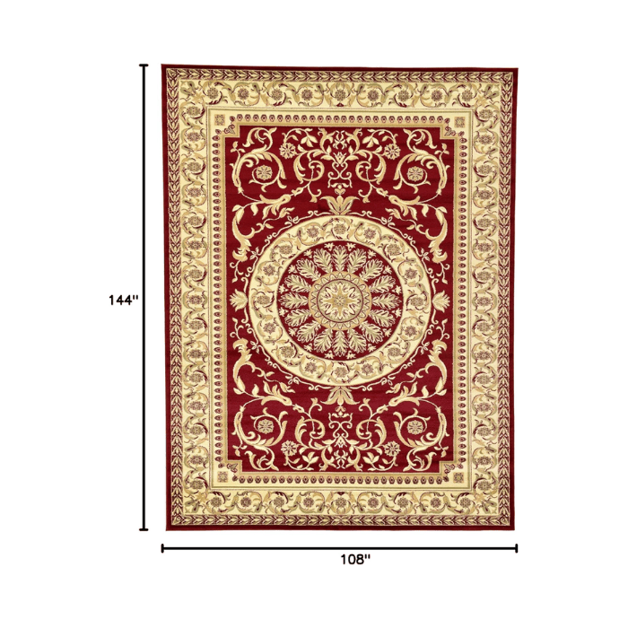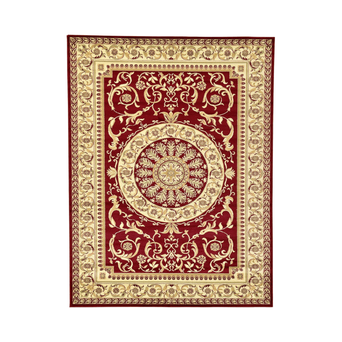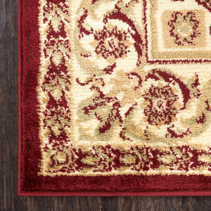 Elegant Traditional Design: Features a rich medallion and floral motif in burgundy and ivory tones, accented with cream, green, and tan for timeless European charm.